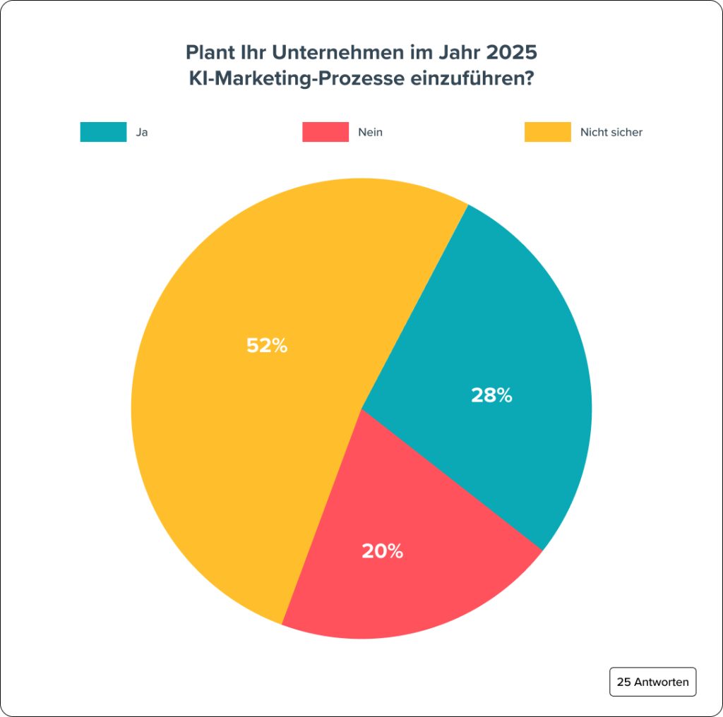 Wir haben diejenigen, die mit „Nein“ geantwortet haben, gefragt, ob ihre Unternehmen planen, im Jahr 2025 KI-Marketing-Prozesse einzuführen. Von den 25, die geantwortet haben, sagten 28 % ja. Darüber hinaus waren sich 52 % nicht sicher, sodass ihre Unternehmen durchaus auch in diesem Jahr KI-Lösungen und -Funktionen in ihr Marketing integrieren könnten.
