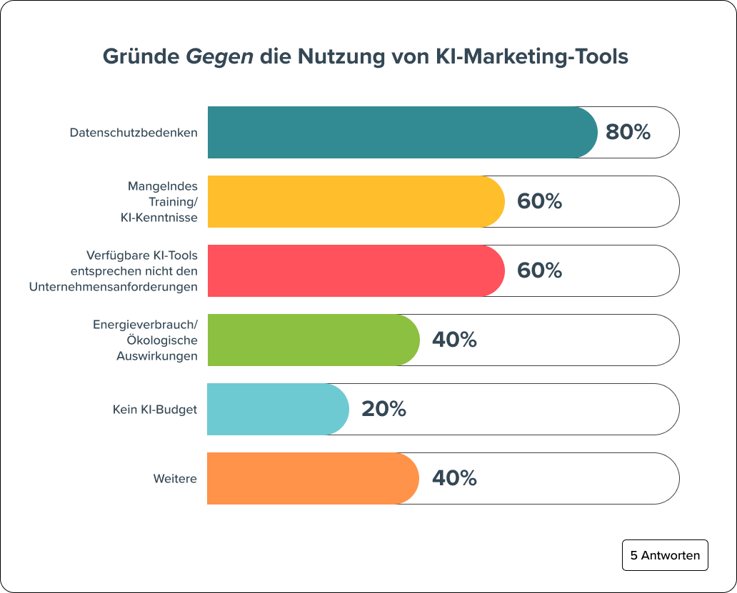 Wir haben die 5 Unternehmen, die mit „Nein“ geantwortet haben, gefragt, warum sie keine Pläne zur Implementierung von KI haben. Ihre Gründe spiegeln viele der Fragen und Kritikpunkte an KI wider, die über das Marketing hinaus bestehen.