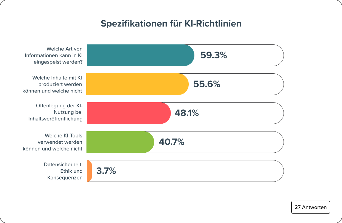 Einer unserer Befragten erwähnte, dass „[KI-Richtlinien] die Nutzung einschränken, da KI-generierte Inhalte in einigen Formaten nicht akzeptiert werden“, was unterstreicht, wie wichtig es ist, Standards zu schaffen, die eine zuverlässige Regulierung ermöglichen, ohne das kreative Potenzial Ihres Marketing-Teams einzuschränken.
