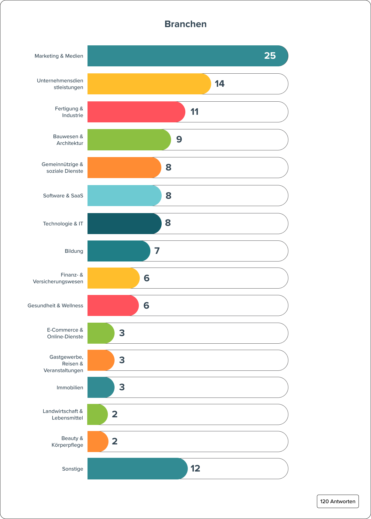 Die meisten Antworten (60,3 %) kamen von der mittleren bis oberen Führungsebene im Marketing, gefolgt von einzelnen Mitarbeitern (27,8 %). Dies zeigt, dass die meisten unserer Erkenntnisse von Marketing-Entscheidungsträgern und ihren Teams stammen, mit einigen wenigen Perspektiven aus der oberen Führungsebene.