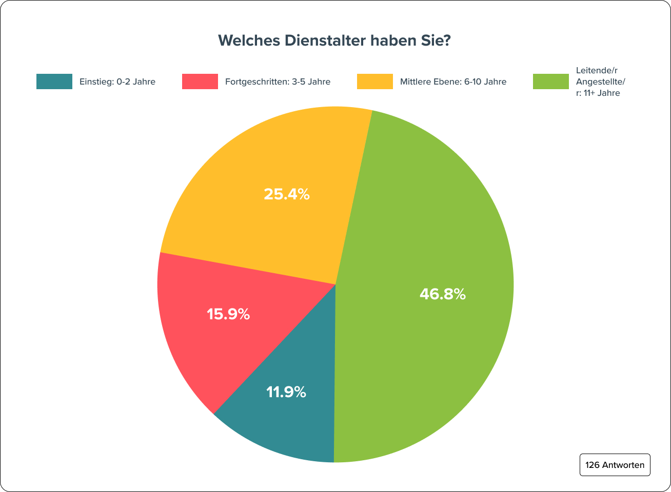 Fast drei Viertel (72,2 %) der Befragten sind seit über 6 Jahren in der Branche tätig. Viele dieser Befragten können wichtige Einblicke und Einschätzungen zu den grundlegenden Veränderungen in der Marketing-Praxis seit dem KI-Boom um das Jahr 2020 geben.