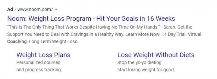 Warum es funktioniert: Ein guter Ort für schriftliche Bewertungen? Google-Anzeigen. Noom weiß das und hat eine Rezension genau dort platziert, wo jeder sie sehen kann, um zu zeigen, dass die derzeitigen Kunden und Kundinnen das Gefühl haben, dass sie die Zeit haben, die Lösung des Unternehmens problemlos in ihren Alltag zu integrieren. Es gibt keinen besseren Weg, Aufmerksamkeit zu gewinnen, als zu zeigen, was echte Kunden und Kundinnen sagen.