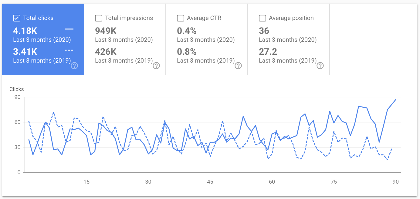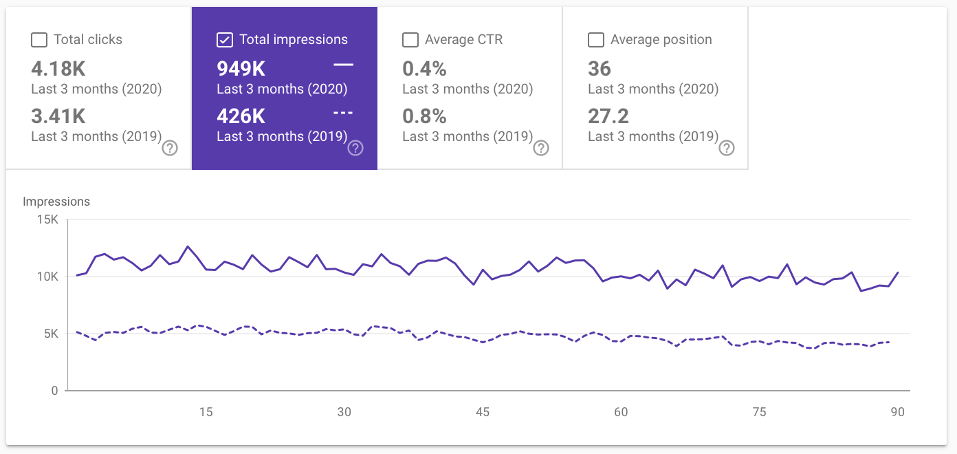 We optimized and created a bunch of landing pages in Q1 of 2020. As a result, we are now ranking poorly for a ton of new keywords that we weren’t ranking for at all last year. We can prove this by doing a year-over-year comparison for the number of search results our site is showing up in (impressions):