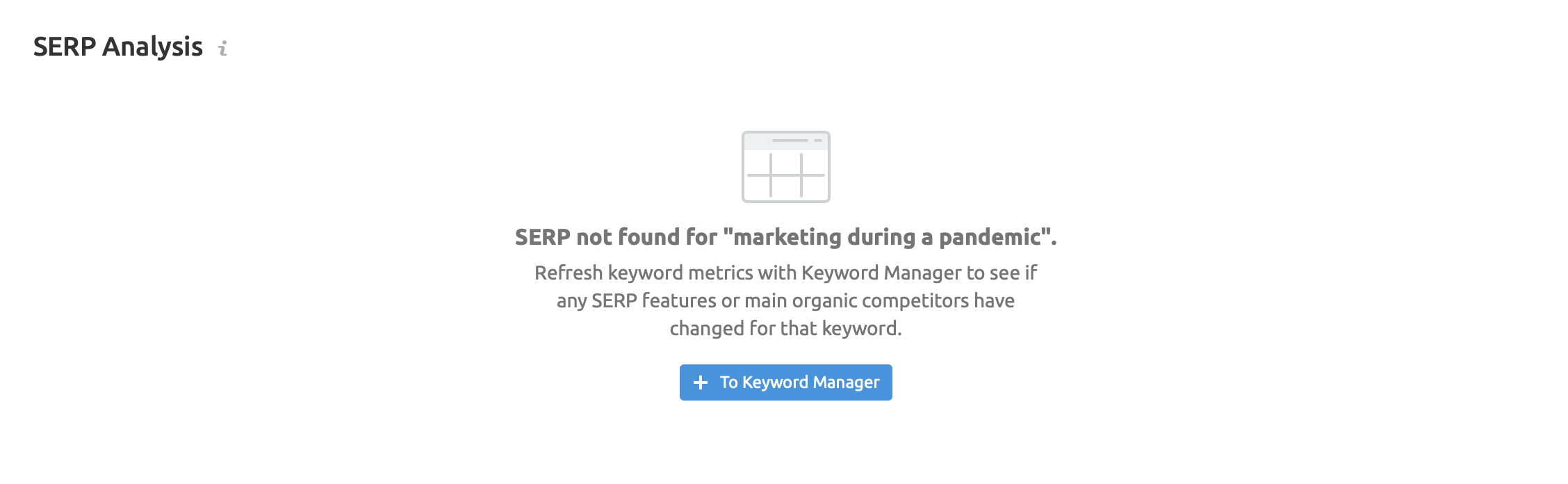 And unfortunately, we’re blind to a lot of this activity because keyword data hasn’t caught up. Case in point, SEMrush isn’t even showing us the SERPs for the long-tail keyword “marketing during a pandemic:”
