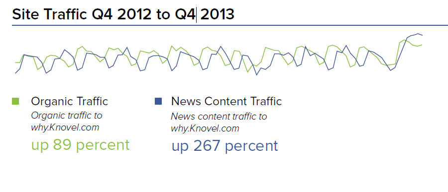 News content traffic rose 267 percent year-over-year in 2012 because of added exposure through Google News. Presence in less-cluttered search categories enabled Knovel to reach new prospects, and the daily updates also caught the attention of major news outlets that linked back to why.knovel.com’s content in their own reports.